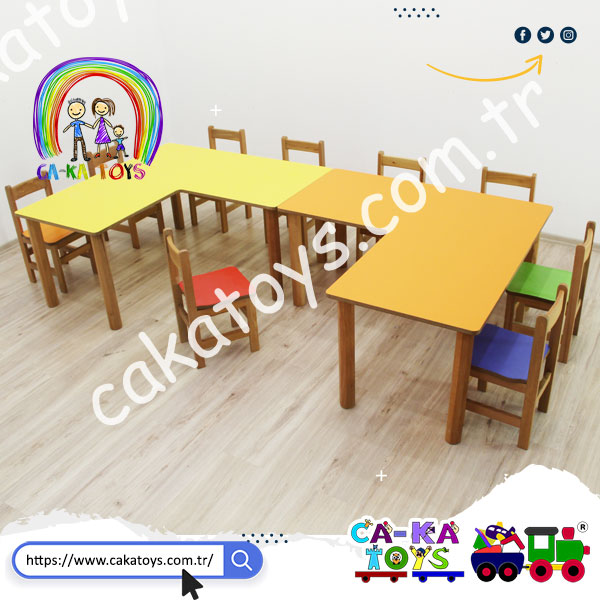 V Masalar biririnden bağımsız olarak kullanılabilmekte ve 60x120 cm Anaokulu masalarıyla birleştirilerek farklı tasarımlar oluşturulabilmektedir.